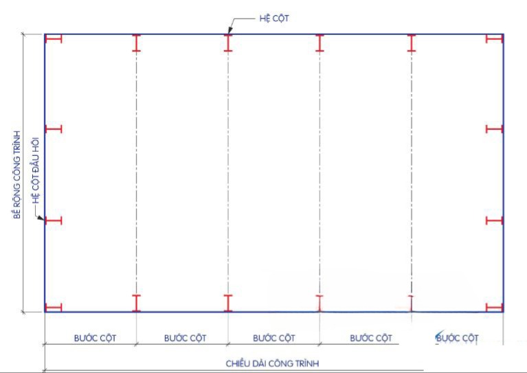 • Bước cột: Khoảng cách giữa các cột theo phương dọc (thường từ 6 – 12m)
