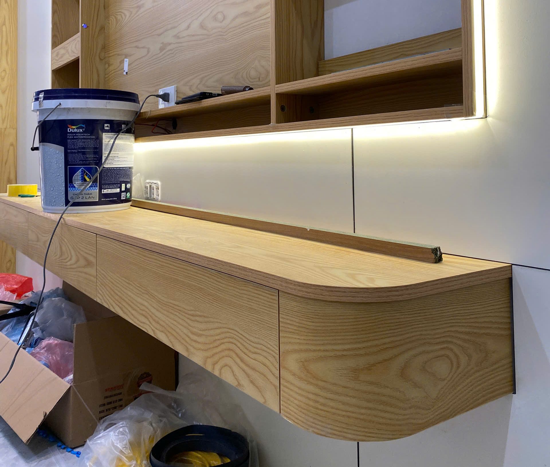 Trong quá trình thi công, những chi tiết phức tạp như các đường bo cong, uốn lượn mềm mại luôn được đặc biệt chú trọng. Mỗi chi tiết bo cong đều được gia công tỉ mỉ, xử lý bề mặt kỹ lưỡng, kết hợp với khâu lắp đặt cẩn thận để tạo nên những đường nét mịn màng, liền mạch và có tính thẩm mỹ cao.