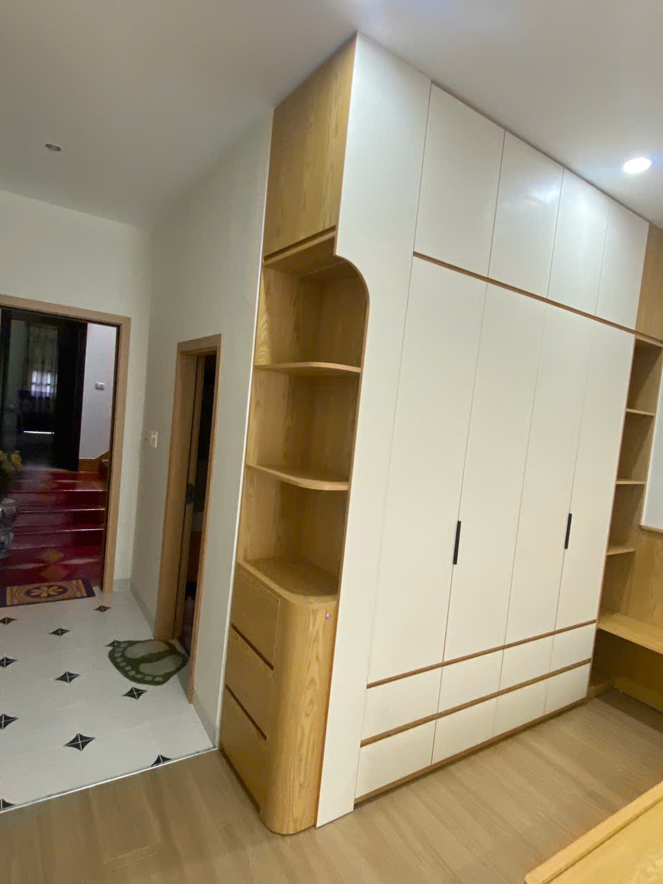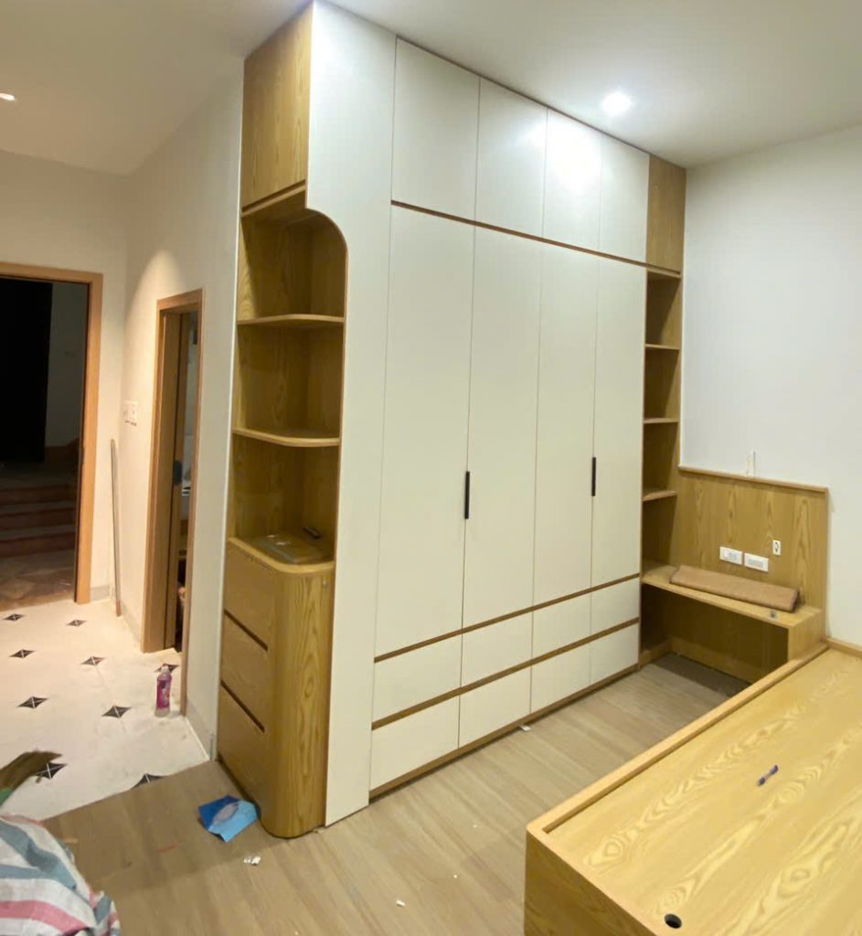 Việc nâng tủ lên sát trần giúp loại bỏ các khoảng trống dễ bụi bẩn, đồng thời tăng tối đa không gian lưu trữ, đặc biệt phù hợp với những gia đình có nhiều đồ dùng hoặc cần phân chia ngăn tủ theo mùa, theo loại.