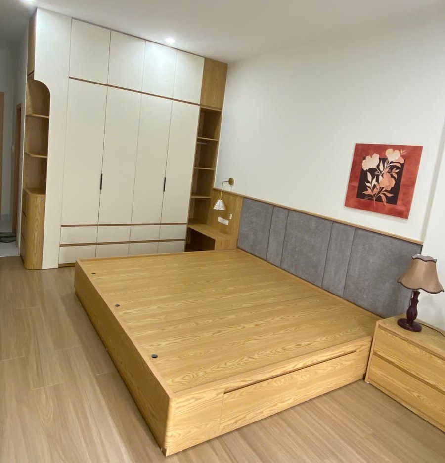 Phòng ngủ tích hợp giường bệt hiện đại kết hợp hộc kéo thông minh – tối ưu không gian, tăng tiện ích sử dụng.