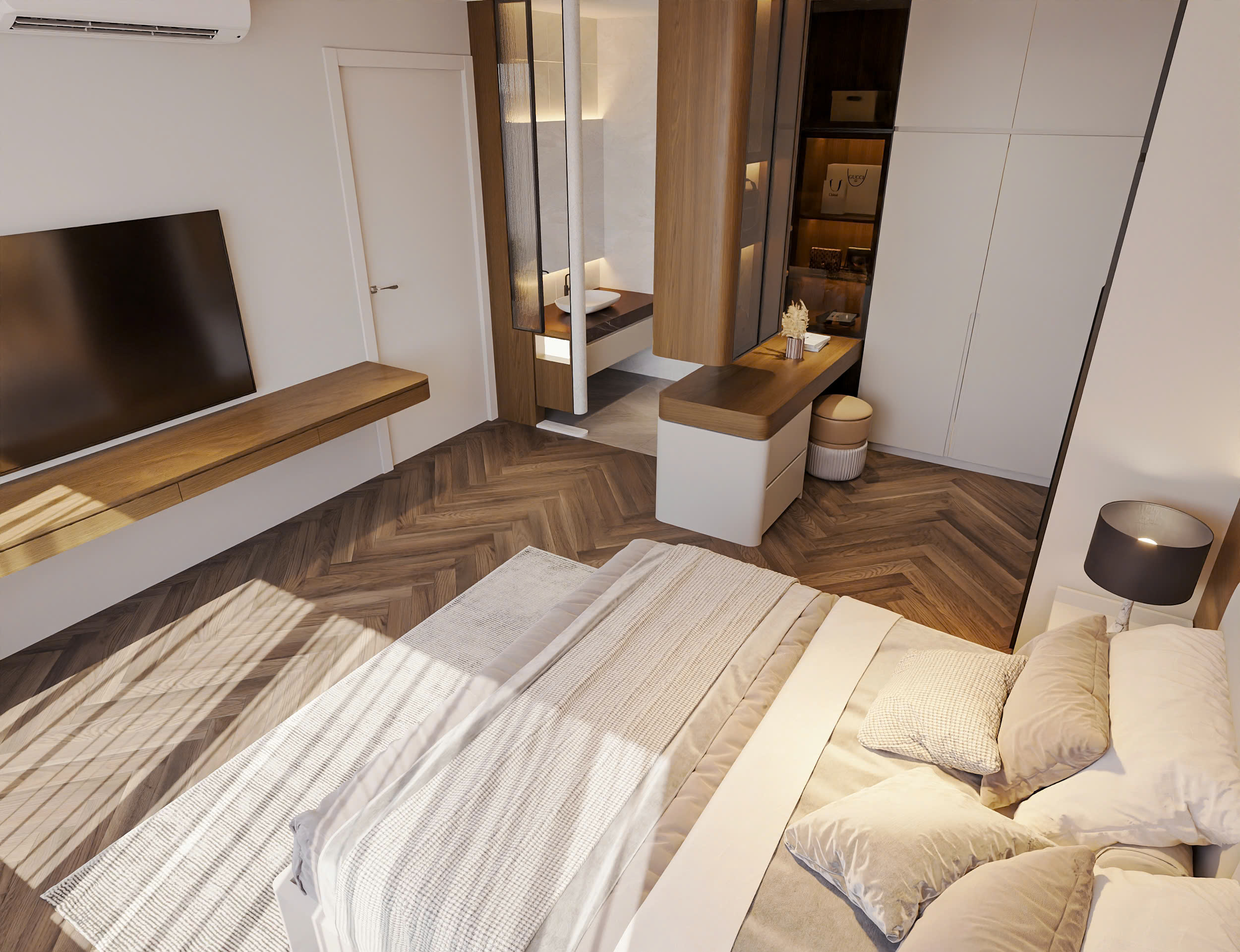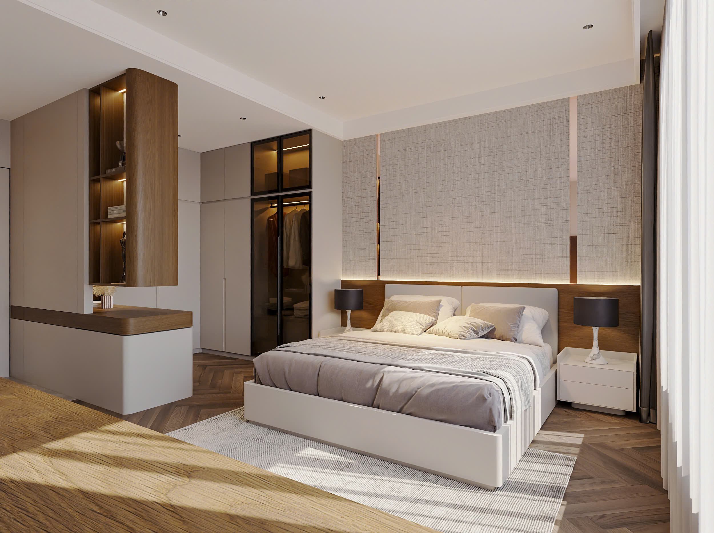 Phòng ngủ trong thiết kế 3D hướng đến sự tối giản và thư giãn. Giường ngủ, tab đầu giường và hệ tủ được bố trí gọn gàng, đảm bảo đầy đủ công năng.