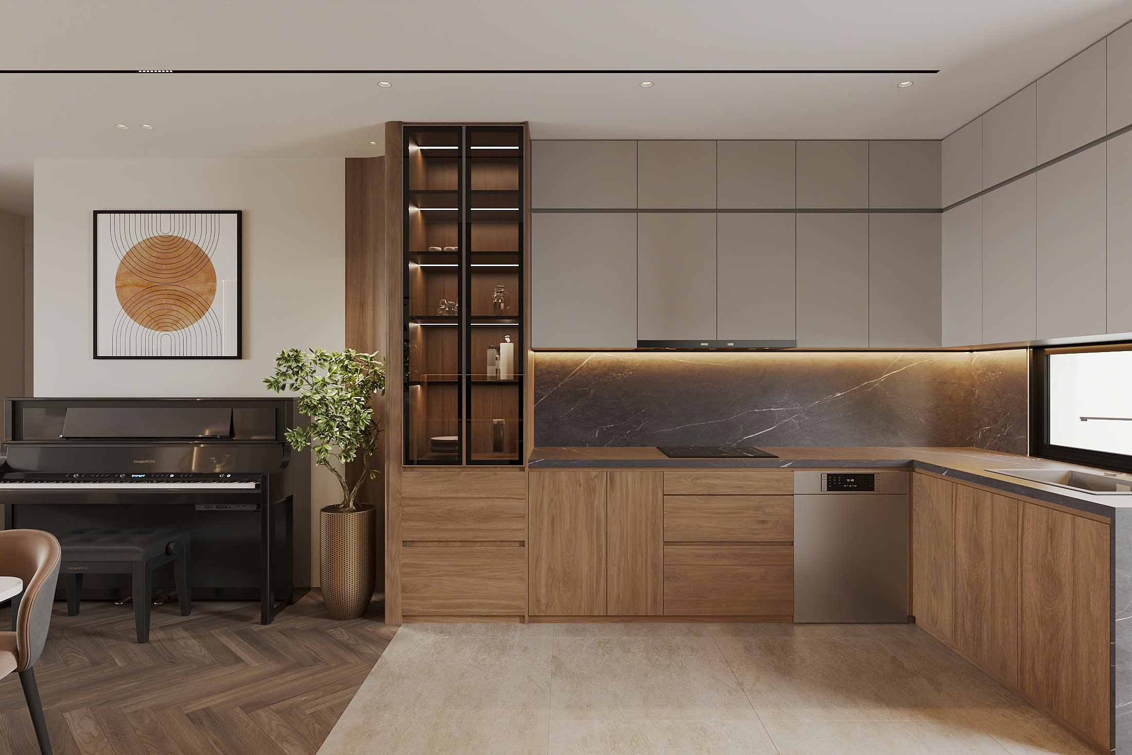 Không gian bếp – ăn được liên kết mạch lạc, tạo sự thuận tiện trong di chuyển và sử dụng.