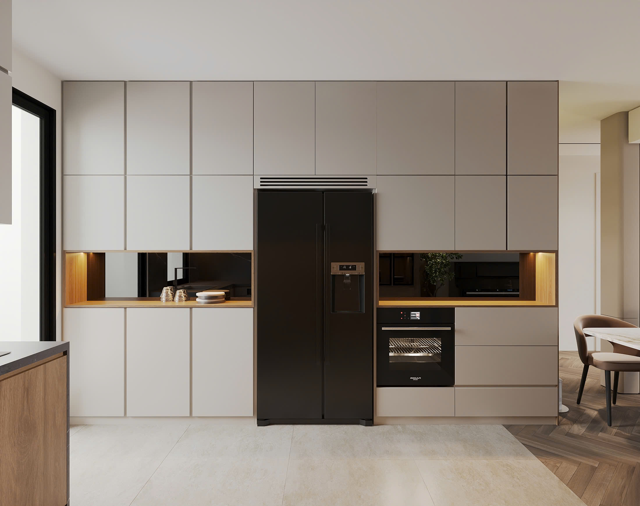 Trong phương án thiết kế 3D nội thất chung cư Hyundai Hà Đông, khu vực bếp được bố trí khoa học với hệ tủ kịch trần giúp tối ưu không gian lưu trữ.