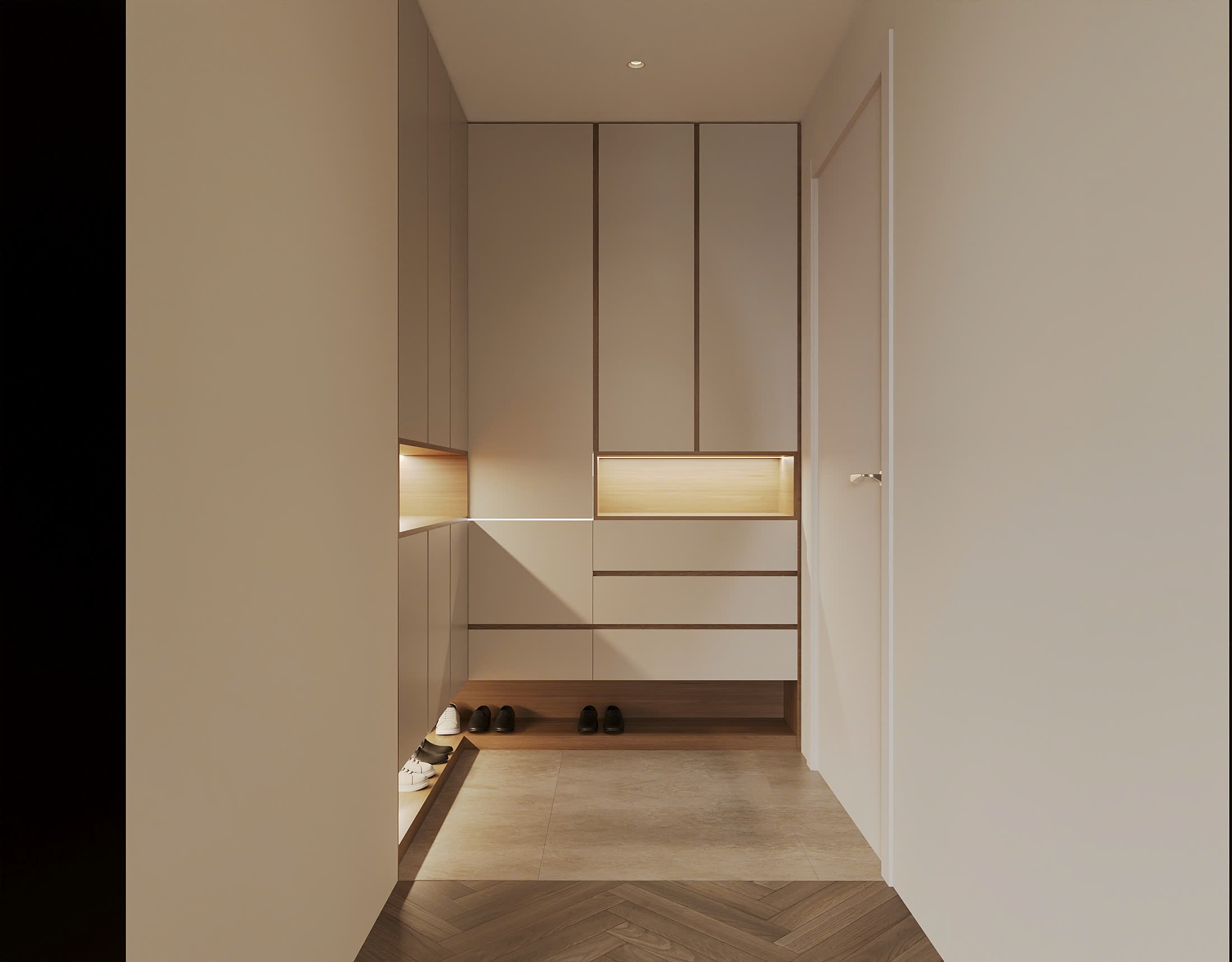 Ngay từ khu vực cửa ra vào, thiết kế đã tích hợp tủ giày âm tường giúp tối ưu diện tích. Đây là giải pháp phổ biến trong các căn hộ hiện đại nhằm giữ cho không gian luôn gọn gàng.