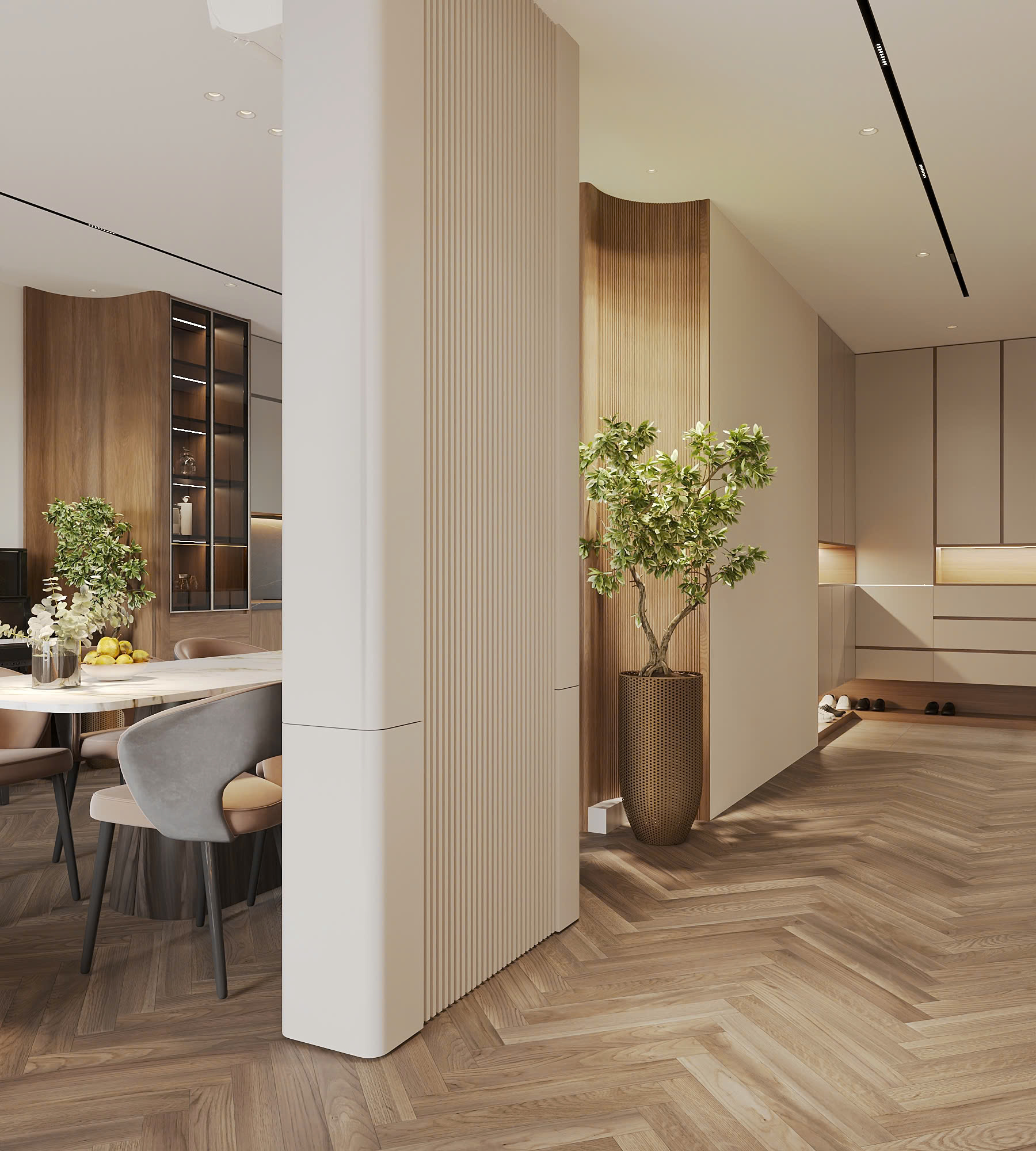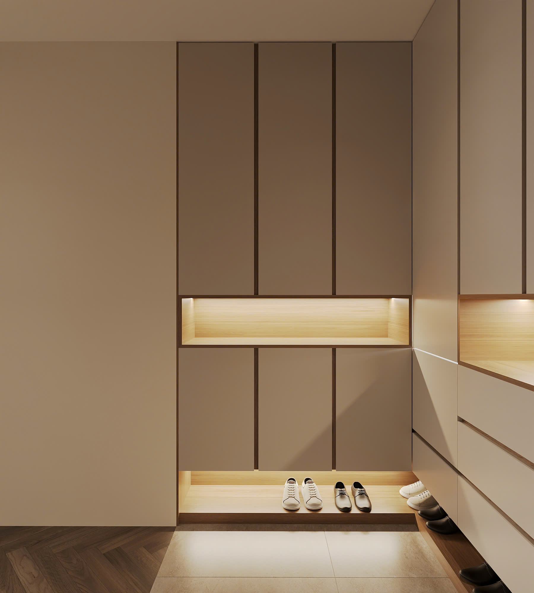 Ngoài chức năng lưu trữ, khu vực này còn được thiết kế như một điểm chuyển tiếp nhẹ nhàng trước khi bước vào không gian chính.