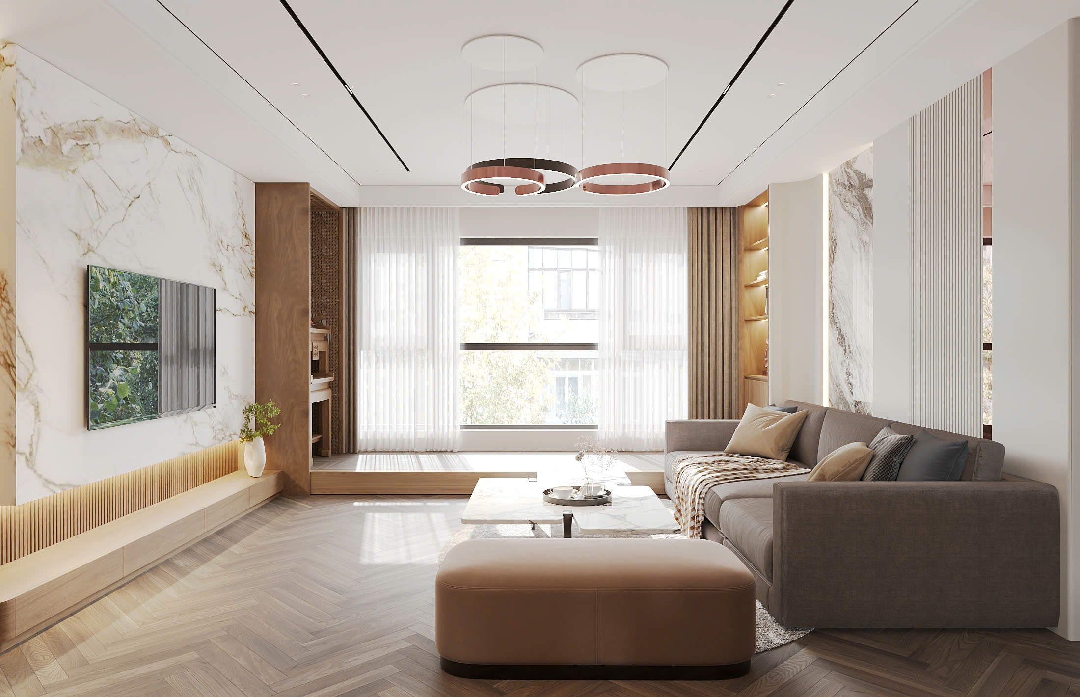 Không gian phòng khách trong bản thiết kế 3D được bố trí theo dạng mở, liên kết trực tiếp với khu vực bếp nhằm tạo cảm giác rộng rãi và liền mạch cho toàn bộ căn hộ. Điểm nhấn nổi bật nằm ở hệ vách tivi kết hợp giữa vật liệu đá và vách nan gỗ, giúp tăng chiều sâu và mang lại vẻ đẹp hiện đại, sang trọng. Kệ tivi được thiết kế dạng đặt đất tối giản, vừa đảm bảo công năng sử dụng vừa giữ cho tổng thể không gian gọn gàng, thanh thoát.