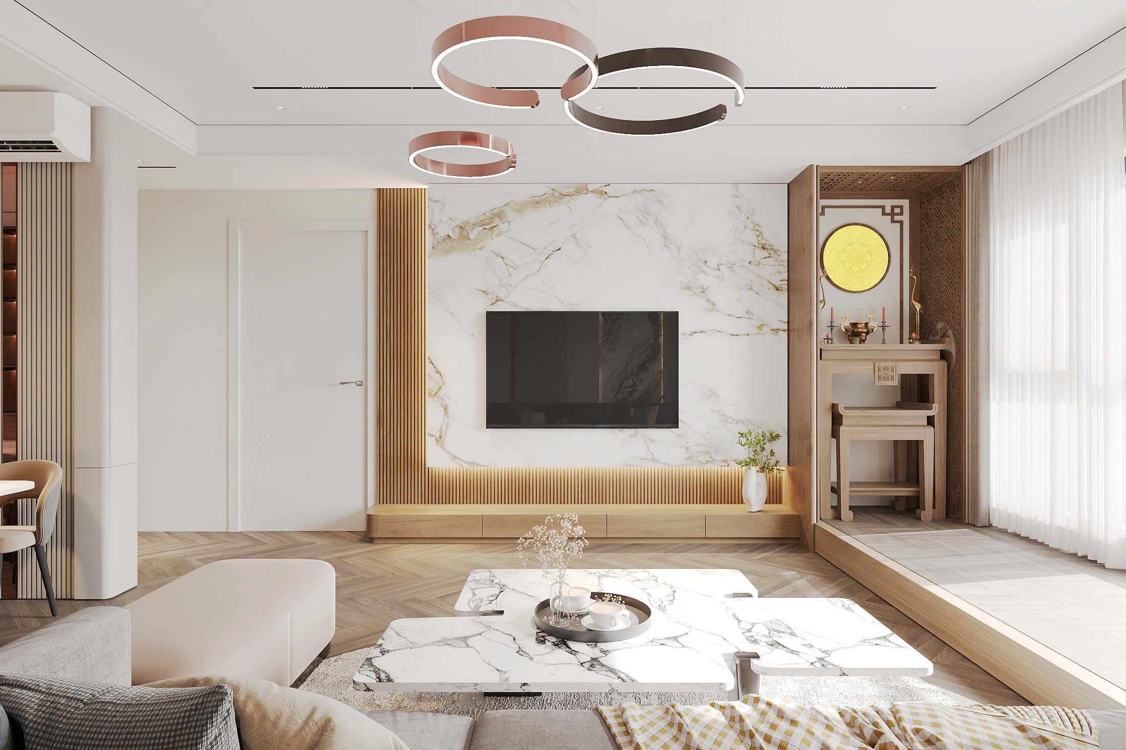 Đặc biệt, khu vực phòng khách còn được tích hợp bàn thờ treo bố trí gọn gàng, đảm bảo yếu tố phong thủy nhưng vẫn giữ được sự tinh tế, không làm ảnh hưởng đến tổng thể thẩm mỹ chung.