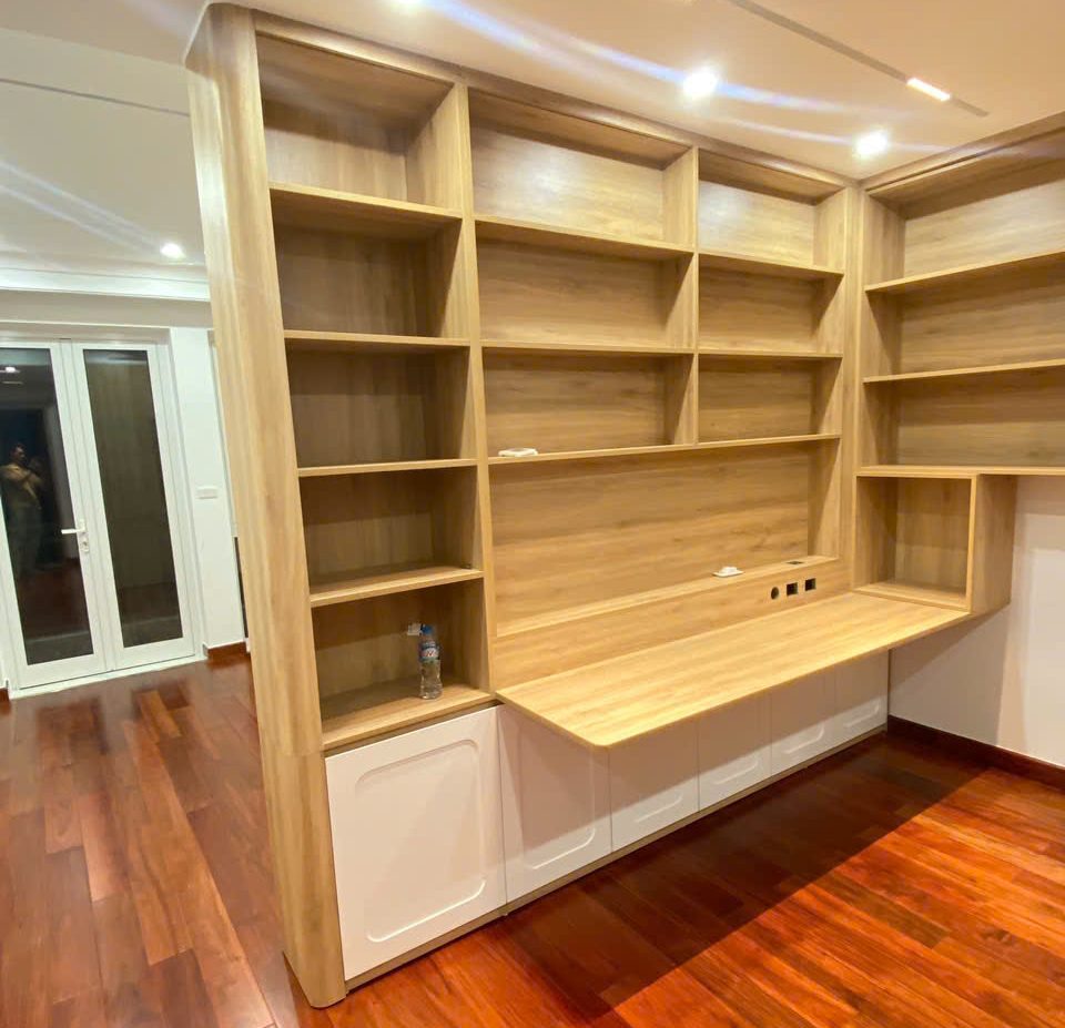 • Hệ tủ sách & kệ trang trí: Chất liệu gỗ công nghiệp phủ melamine chống trầy, bền đẹp, thẩm mỹ.