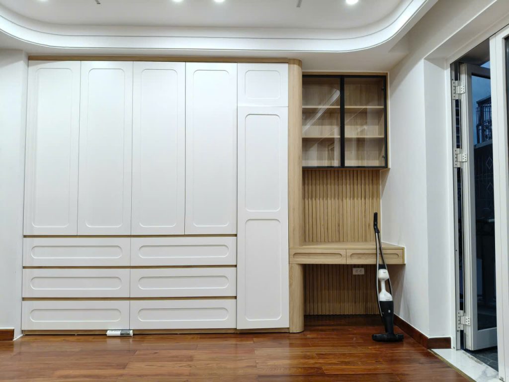 • Tủ quần áo âm tường: Kết hợp màu trắng – vân gỗ, tạo sự sang trọng và rộng rãi.